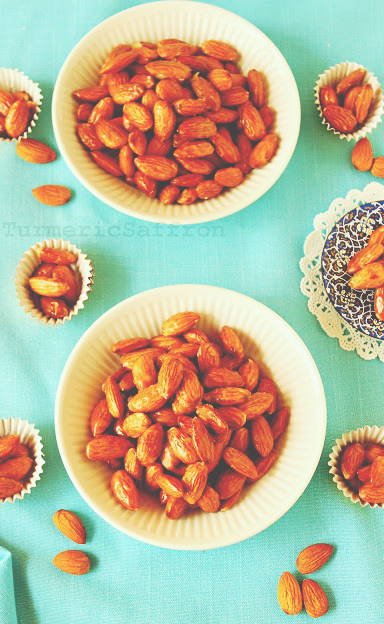 It's that fourth dimension of the twelvemonth in ane trial to a greater extent than for setting upwardly the haft-seen table amongst the gorgeously displayed 7 S's, lush dark-green sabzeh, colorful hyacinth bulbs, forever beautiful tulips or whatever other types of saltation flowers, fresh fruits, ajil (trail-mix) as well as delicious traditional sweets. Memories of by Nowruz celebrations are precious, from shopping for novel clothes, receiving eidy (money from elders inward the family), did-o-bazdid (visiting identify unit of measurement as well as friends) as well as of course of written report beingness off for xiii days from school. The Nowruz sweets were only unforgettable as well as I liked them all. One of those goodies, which was a favorite of mine growing up, is بادام سوخته badam sookhteh. I can't imagine life without badam (almonds). They can survive enjoyed all twelvemonth long for whatever occasion mixed amongst other nuts as well as seeds inward ajil, or survive transformed into a delicious concoction such every bit toot (marzipan). This recipe makes a wonderful crunchy improver to the array of home-made Nowruz confections.